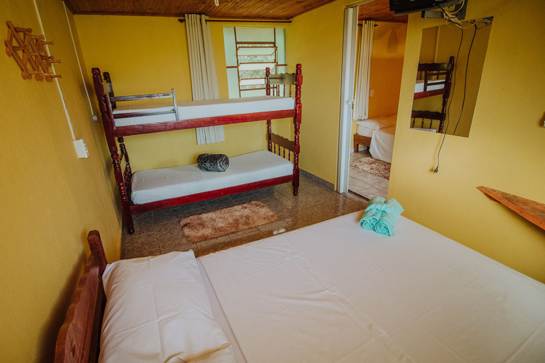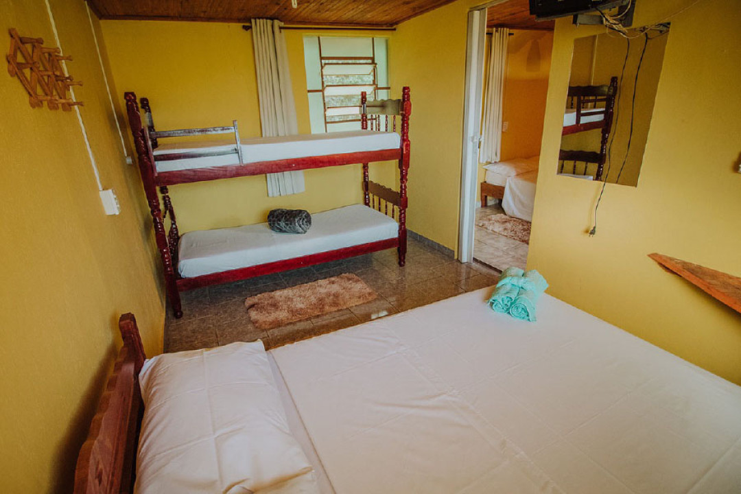 De um lado 1 cama de casal e banheiro com adaptação para idosos e deficientes, no outro ambiente 1 cama de casal e 1 beliche com as roupas de cama e de banho.