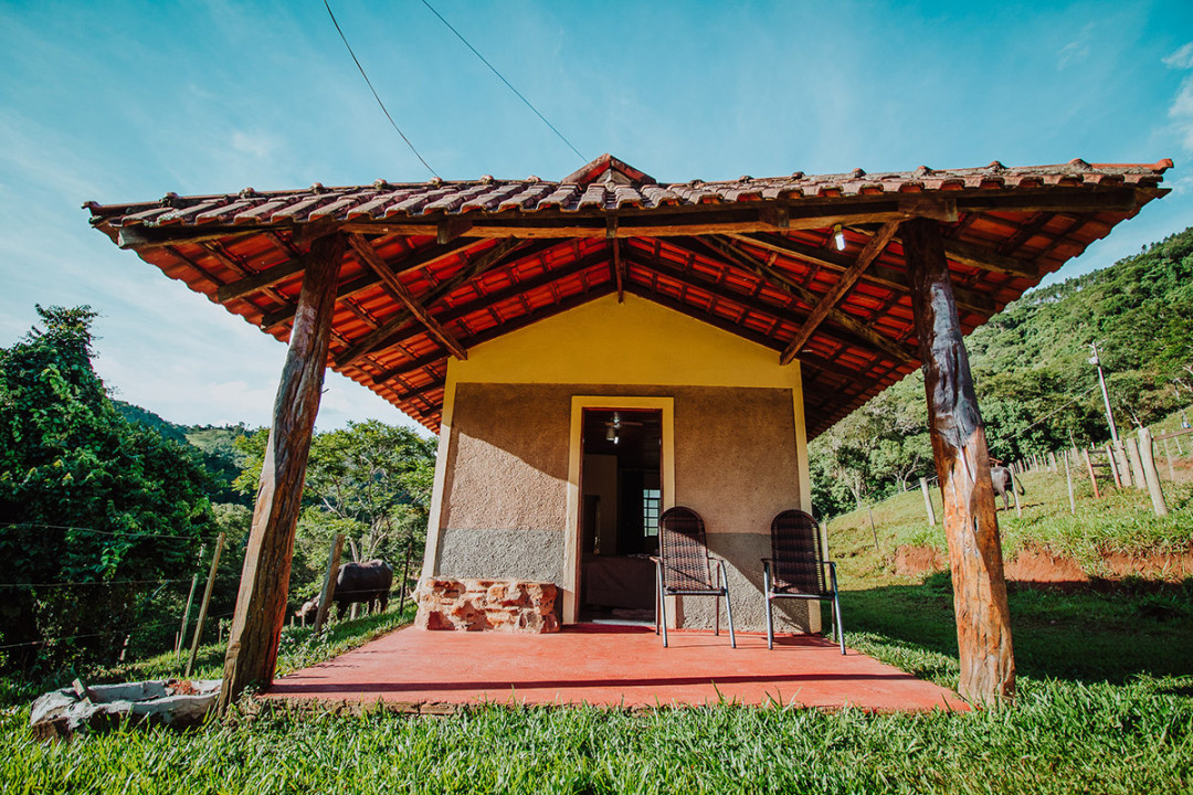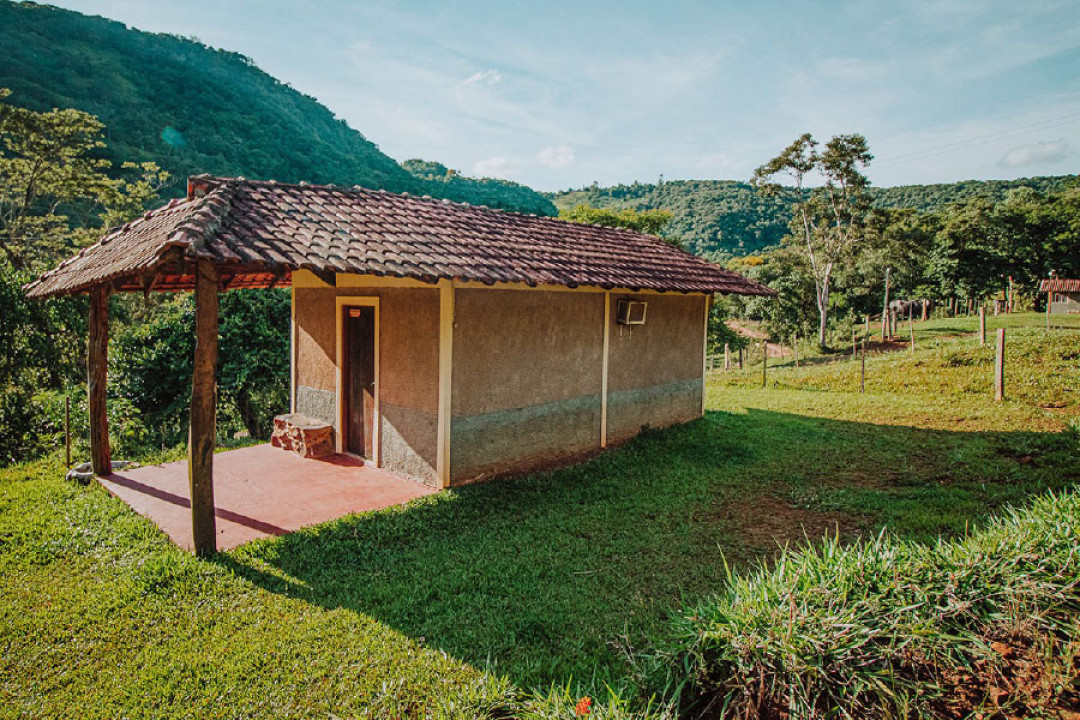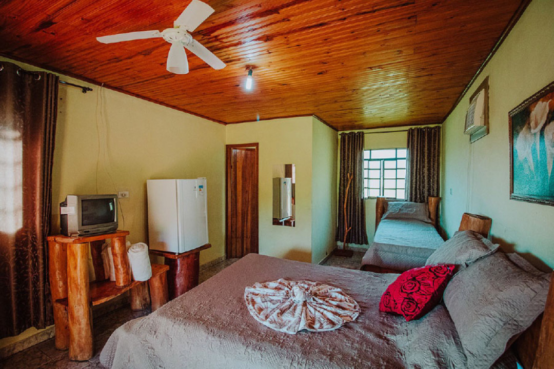 Três chalés que contam com ar-condicionado, sendo o número 1 e 2 com ar frio e com aquecedor disponível no inverno. E o número 3 com ar quente/frio. /ventilador de teto/frigobar/televisor/chuveiro aquecido a gás/Janelas teladas. É um cômodo com móveis artesanais de madeira, com cama de casal, uma cama de solteiro e com um colchão extra, que pode ser colocado no piso para acomodar até 4 pessoas, banheiro interno, varanda com lugar para rede (hóspede deve trazer a rede).