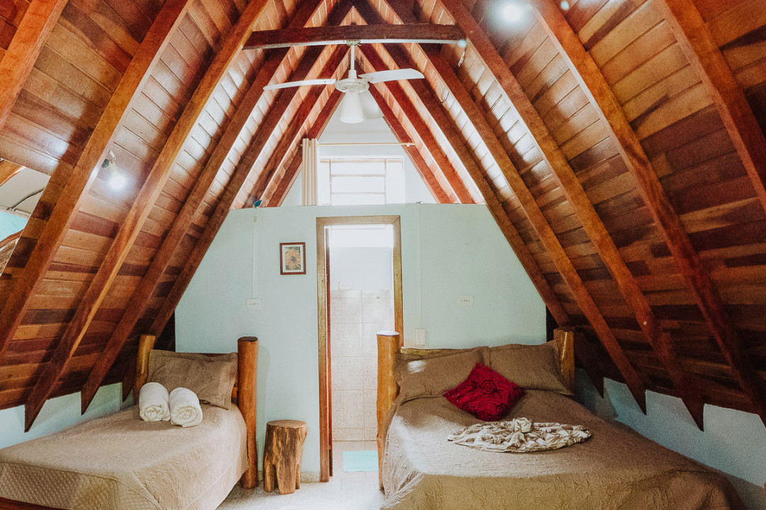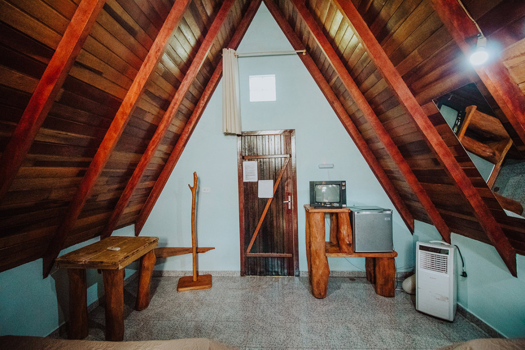 Conta com ar-condicionado(quente/frio), frigobar, televisor, chuveiro aquecido a gás. Um cômodo com móveis artesanais de madeira, janelas teladas, com uma cama de casal, uma cama de solteiro e um colchão extra, que pode ser colocado no piso para acomodar até 4 pessoas, banheiro interno, varanda com lugar para rede (o hóspede deve trazer a rede).