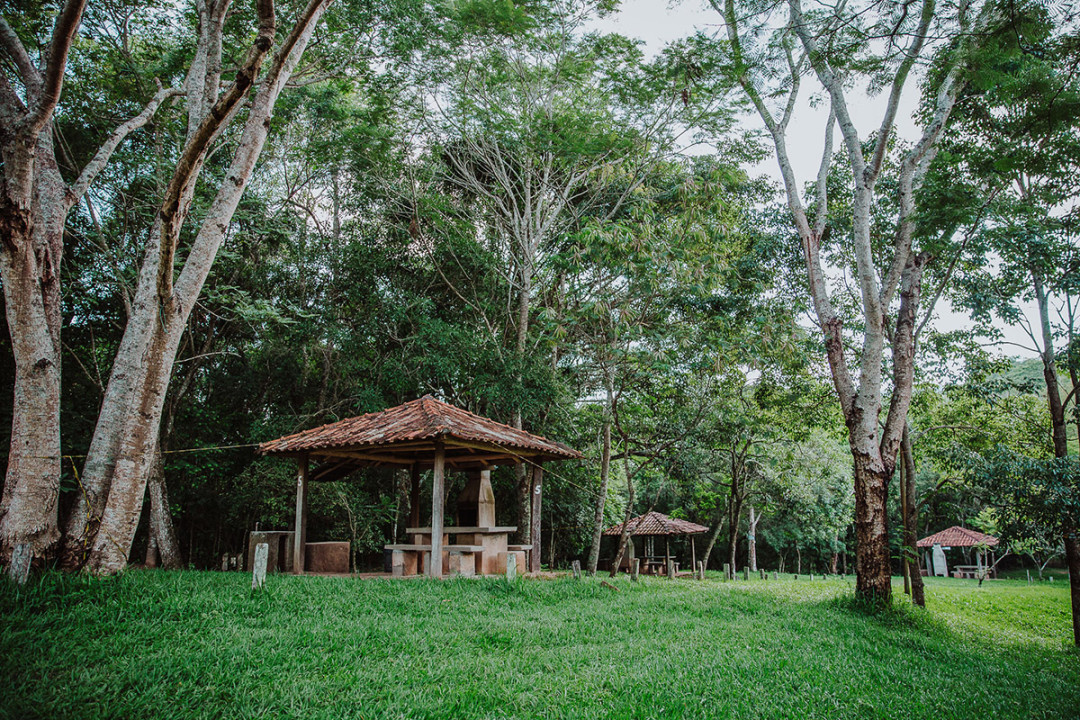 Cobertura 3x3 metros com mesa, banco de concreto, pia, churrasqueira de concreto armado (trazer grelha de 47 cm de largura para encaixar na canaleta da churrasqueira, comprimento pode ser de 35 a 50 cm ou alugar grelha no restaurante com taxa de limpeza e com depósito calção no restaurante).